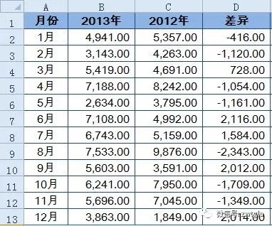 以下面这个模拟的销售数据表为例,B列和C列分别是13年和12年同期的销售数据,D列用来计算两组数据的差异情况。